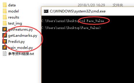 环境搭建完成后,解压相关文件中的Face_Value.rar文件,cmd窗口切换到解压后的*.py文件所在目录。