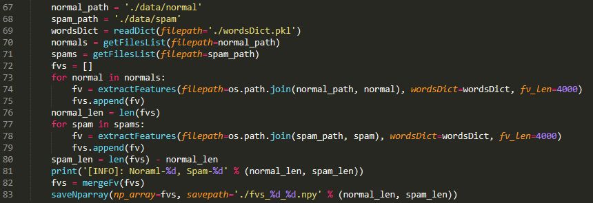 最终结果保存在"fvs_%d_%d.npy"文件内,其中第一个格式符代表正常邮件的数量,第二个格式符代表垃圾邮件的数量。