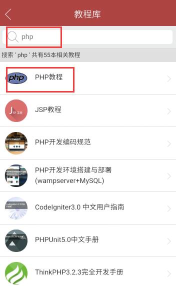 w3cschool app最上方配有搜索引擎功能,只要输入相对应的教程,就会刷出相关系列的教程。