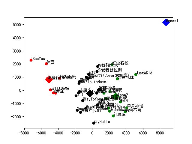 接下来我们尝试先对歌曲的42个特征值进行归一化处理,然后再进行上面的PCA和聚类操作,同时令k=3,最终的聚类结果如下图所示: