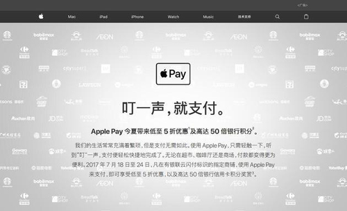 7月13日,苹果中国官网已经发布出了新的活动:2017年7月18日至24日,用户在有银联云闪付标识的指定商铺,使用Apple Pay支付,即可享受低至5折优惠,以及高达50倍银行信用卡积分奖赏。