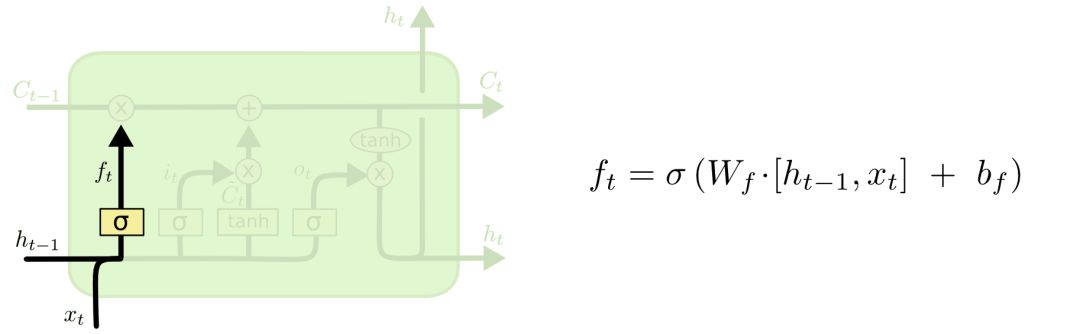 首先,LSTM需要决定哪些信息需要丢弃,哪些信息需要保留。这是通过一个叫做遗忘门的sigmoid层来实现的。它的输入是ht-1xt,输出是一个数值都在0到1之间的向量,表示Ct-1中各部分信息的权重,0表示不让该部分信息通过,1表示让该部分信息全部通过。