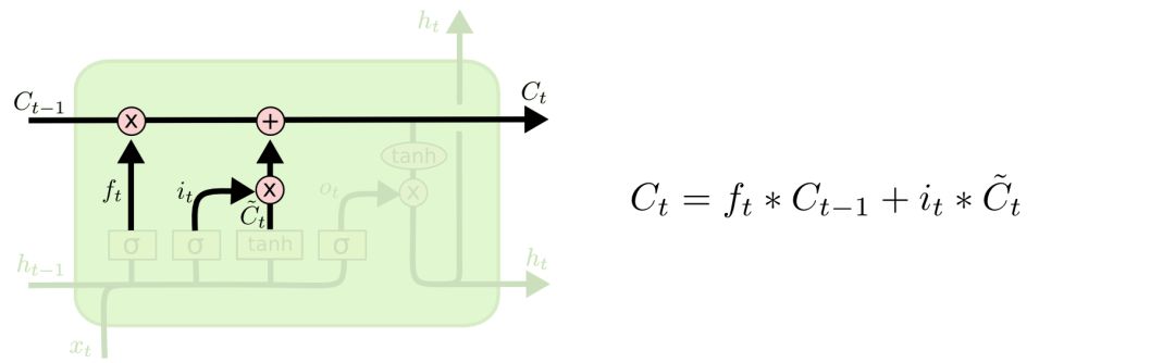有了遗忘门和传入门,我们就能够更新cell的状态了,即把Ct-1更新为Ct
