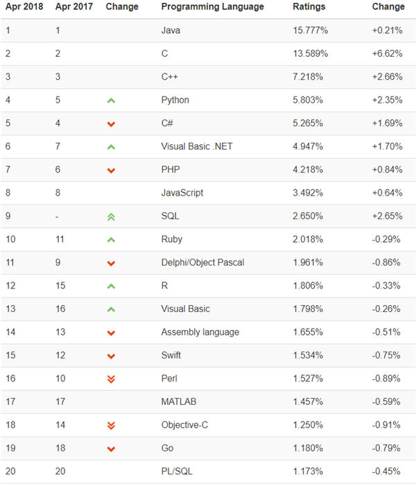 目前,在前20的排行中,Objective-C和Perl下降幅度最大,都下滑了3个名次以上。