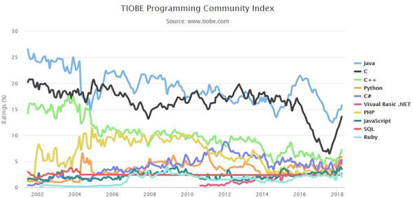 Top 10 编程语言 TIOBE 指数走势(2002-2018)
